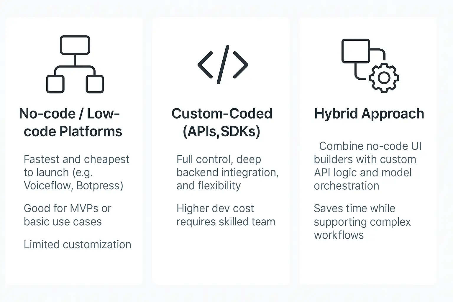 Your front-end, maybe a React app or a simple widget, won’t cost you much aside from dev time. But if you want voice capabilities, tools like ElevenLabs or Whisper can add another $15 to $200 a month.