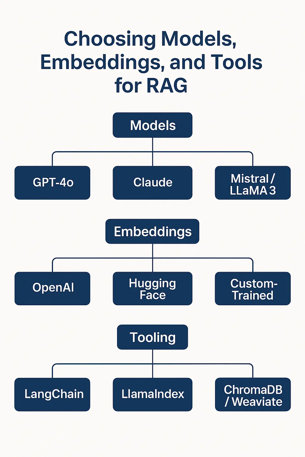 For embeddings, we rely on OpenAI, Hugging Face, or custom-trained ones that align better with niche vocabularies. On the tooling side, frameworks like LangChain, LlamaIndex, and vector stores like ChromaDB or Weaviate help us stitch everything together efficiently.