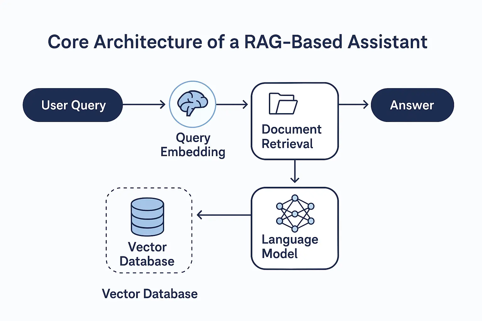 So, how does a RAG based AI assistant actually work behind the scenes? It starts with a user query that gets embedded and compared against a vector database (like ChromaDB or FAISS) filled with your company’s documents. The most relevant pieces are retrieved and passed into the language model (LLM) along with the query.
